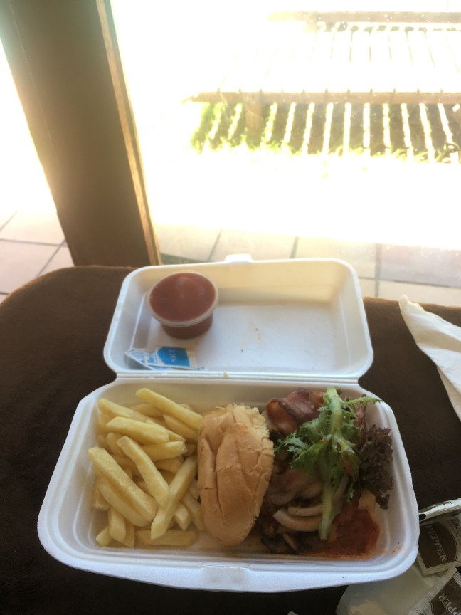 (steak with onions, grilled tomato, two fried eggs, chips, and a coke for R103 = $7.36)