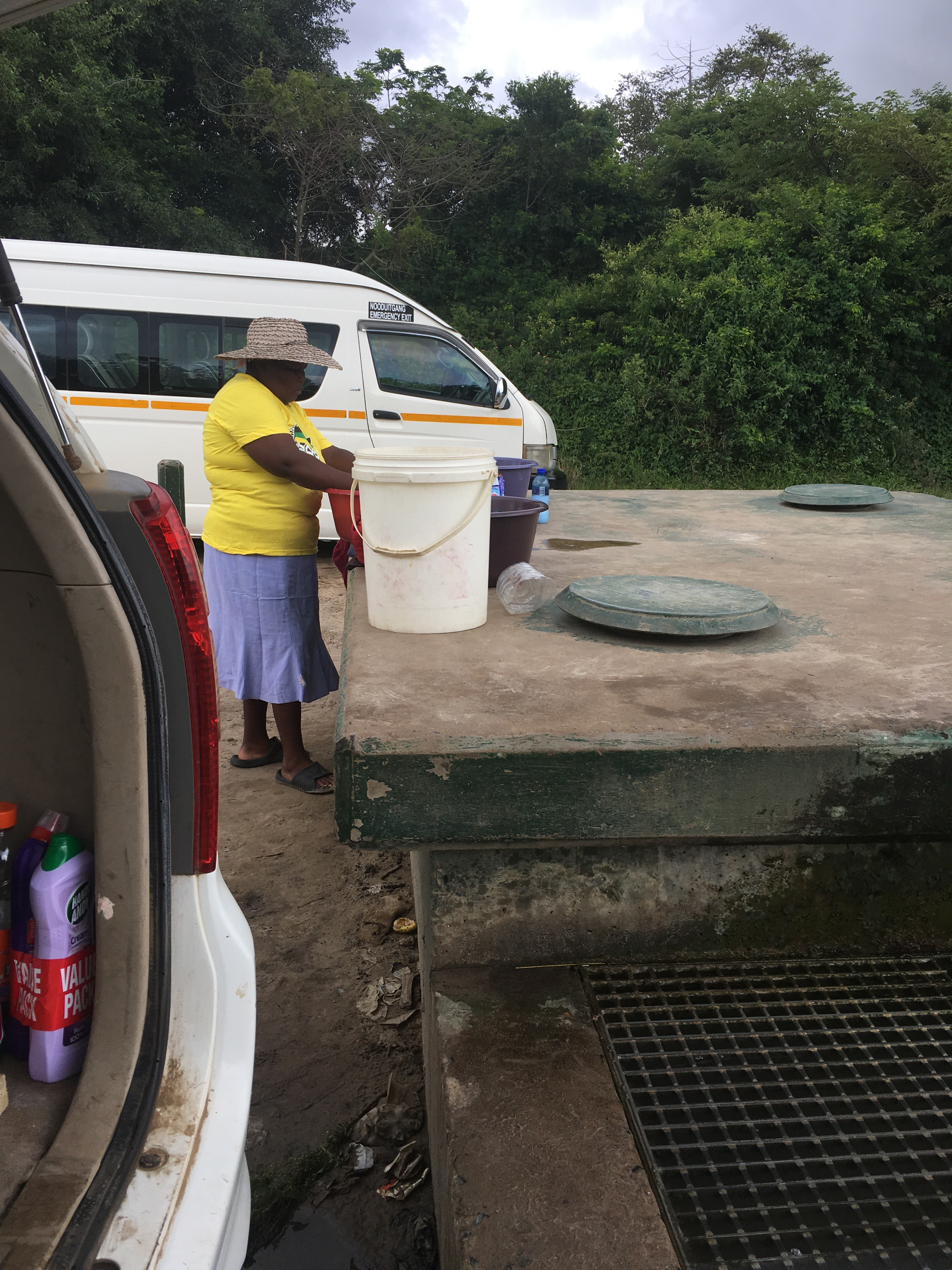 We leave the clinic, drop the patient off at home, and then we head to Ezwenelisha to pick up more people. Even though the sun is hidden behind clouds and there’s a slight drizzle it’s warm outside.